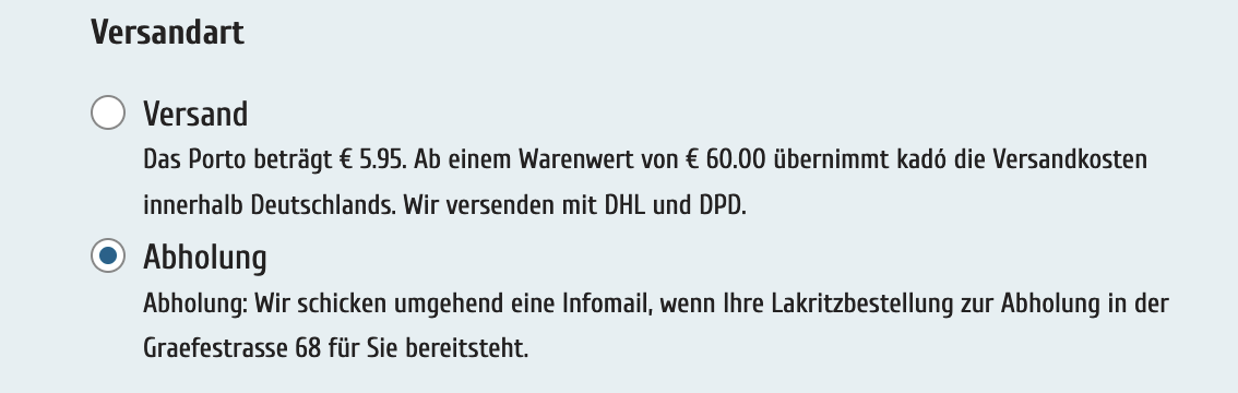 Im weiteren Bestellvorgang bestimmen Sie die Versandart: ist ein Lakritzpäckchen zu schicken oder portofreie Selbstabholung gewünscht? Im letzteren Fall erhalten Sie umgehend eine Email von uns, ab wann Ihre Bestellung zur Abholung während unserer Öffnungszeiten bereitsteht.