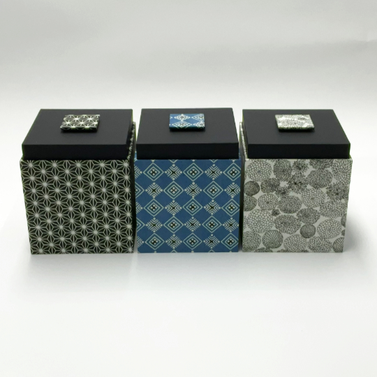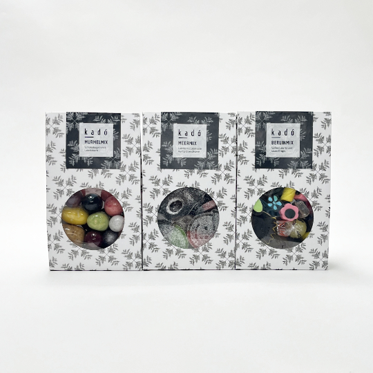 The boxes in Japanese paper are available in three designs. All of them are cut and glued by hand in cooperation with kadó at USE - Union Sozialer Einrichtungen gGmbH in Kreuzberg. They are then filled with liquorice by kadó. Trés chic and ideal for 250g of liquorice.